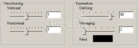 Hef de selectie nog niet op, maar ga naar Effecten - Insteekfilters - Graphics Plus - Emboss. Hier gebruiken we de standaardinstellingen (alle waarden op 0). Alvorens we de selectie opheffen, geven we nog een stanseffect (Effecten - 3D-effecten - Stansefffect) met dezelfde instellingen als in stap 1. Stap 6 Draai de voor- en achtergrondkleur om (wit is nu achtergrondkleur) en herhaal nogmaals stap 2. Nu alleen de afwerking nog! Verklein eventueel je afbeelding (Afbeelding - Formaat wijzigen) en daarna Effecten - Verscherpen - Verscherpen. Stap 7 Daarna door middel van Effecten - Verscherpen - Verscherpen, om je gouden rand te verscherpen. Nu een slagschaduw (Effecten - 3D-effecten - Slagschaduw) met de volgende instellingen: