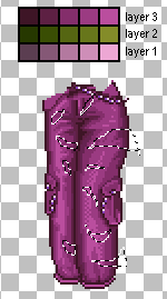 Pixel je broek in de hoofdkleur, in mijn geval dus paars. Maak zoveel kopieen/lagen als kleuren die je wil gebruiken en kleur ze in de goede kleuren. In dit voorbeeld gebruik ik 3 kleuren. Zorg ervoor dat in je Lagen menu de laag met de hoofdkleur bovenaan staat (laag 3). |
