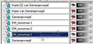 Open het palet Lagen en sluit de laag 'Kopie van DW_Snowman' door op het oogje te klikken. Voeg vervolgens de tag en tekst samen door middel van Lagen - Samenvoegen - Zichtbare lagen samenvoegen.